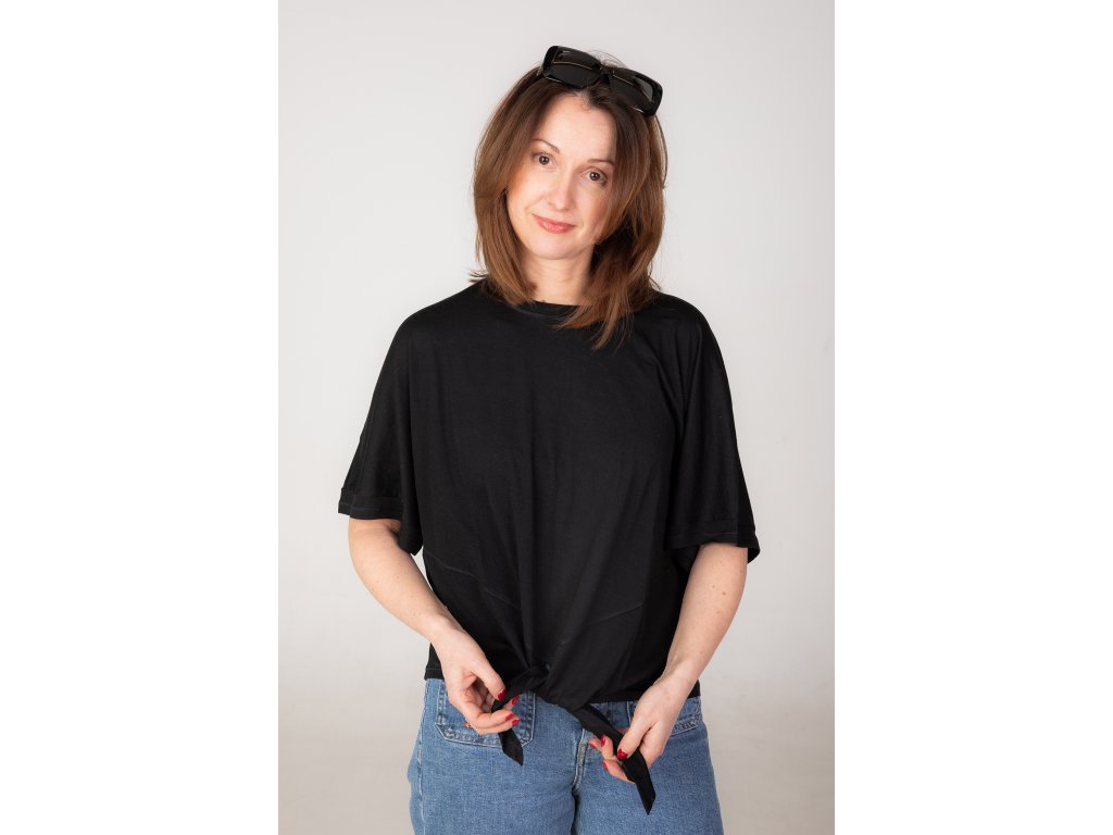 Klíčovým prvkem je zavazování v pase na uzel, díky němuž si můžeš top přizpůsobit přesně podle sebe – volnější, kratší, tvarovaný nebo ležérní vzhled.