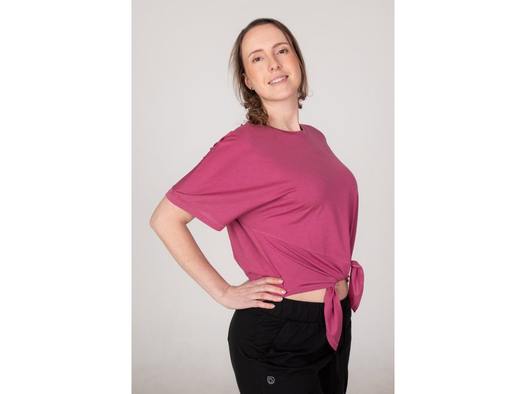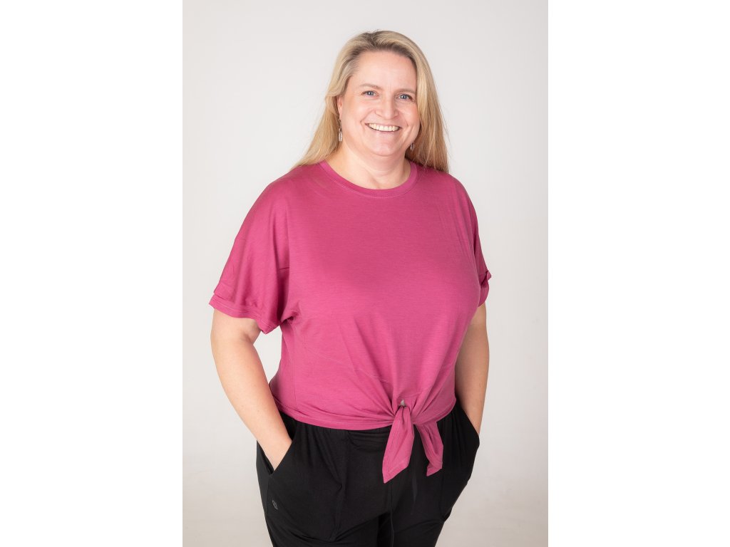Klíčovým prvkem je zavazování v pase na uzel, díky němuž si můžeš top přizpůsobit přesně podle sebe – volnější, kratší, tvarovaný nebo ležérní vzhled.