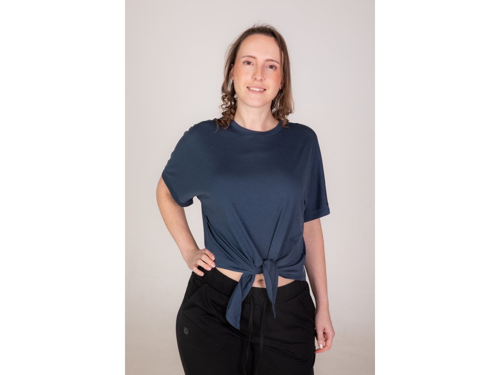 Klíčovým prvkem je zavazování v pase na uzel, díky němuž si můžeš top přizpůsobit přesně podle sebe – volnější, kratší, tvarovaný nebo ležérní vzhled.