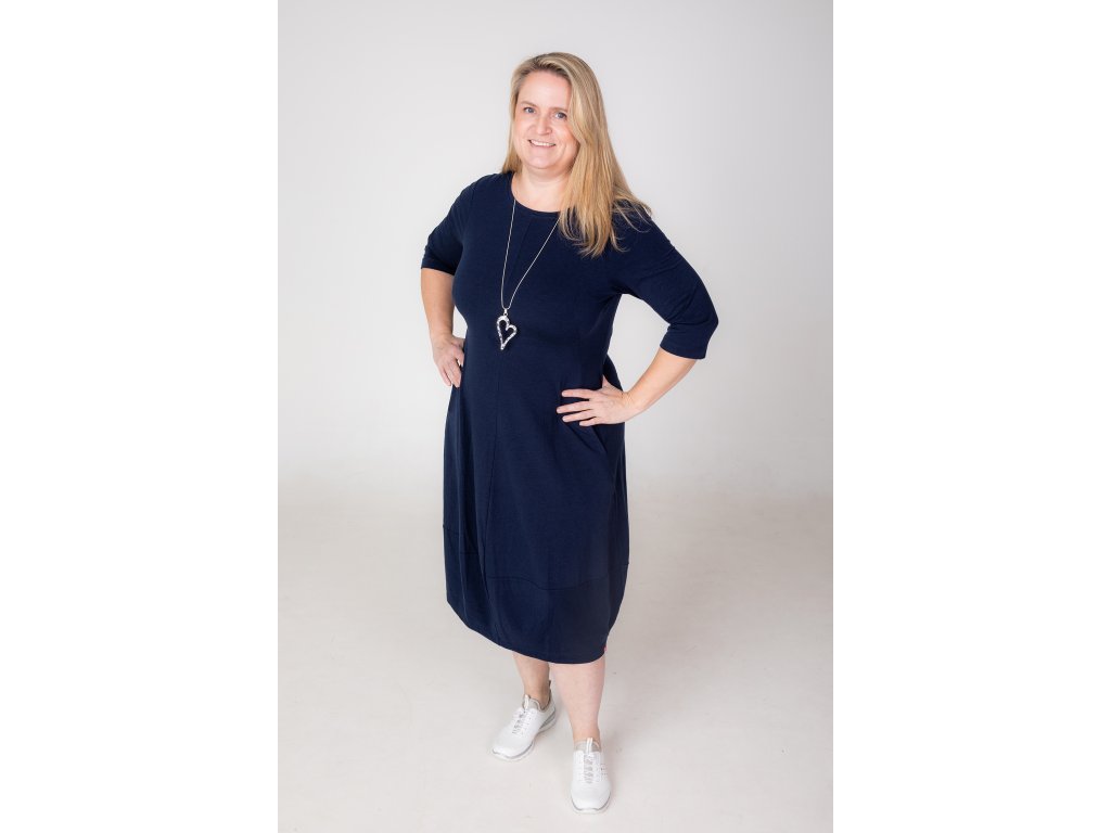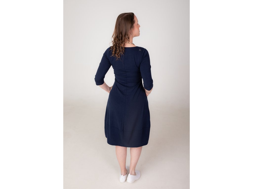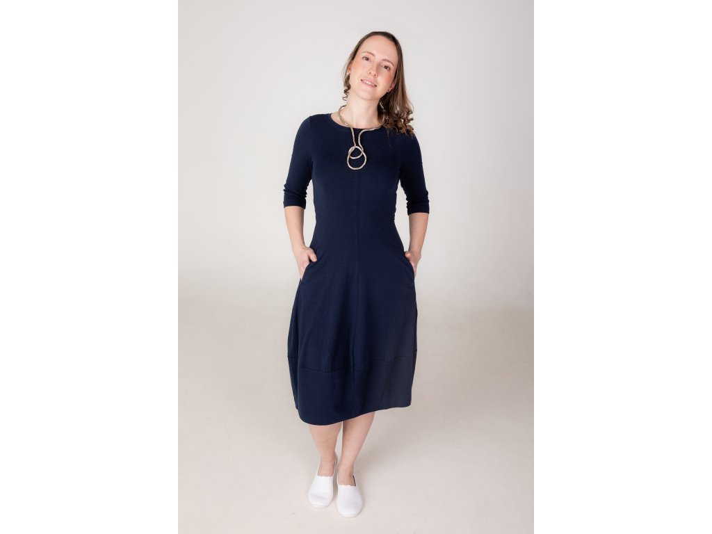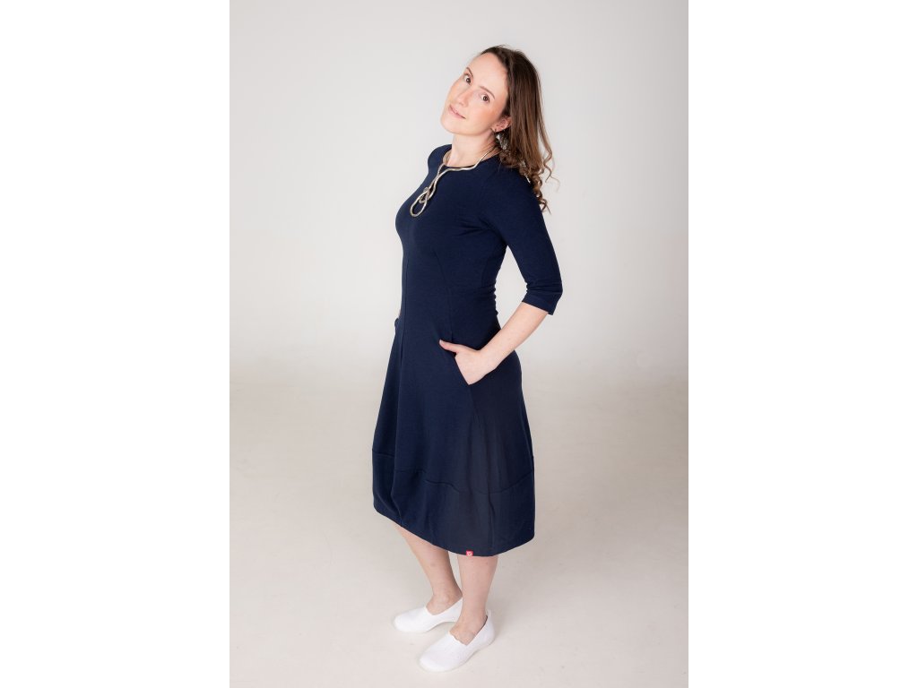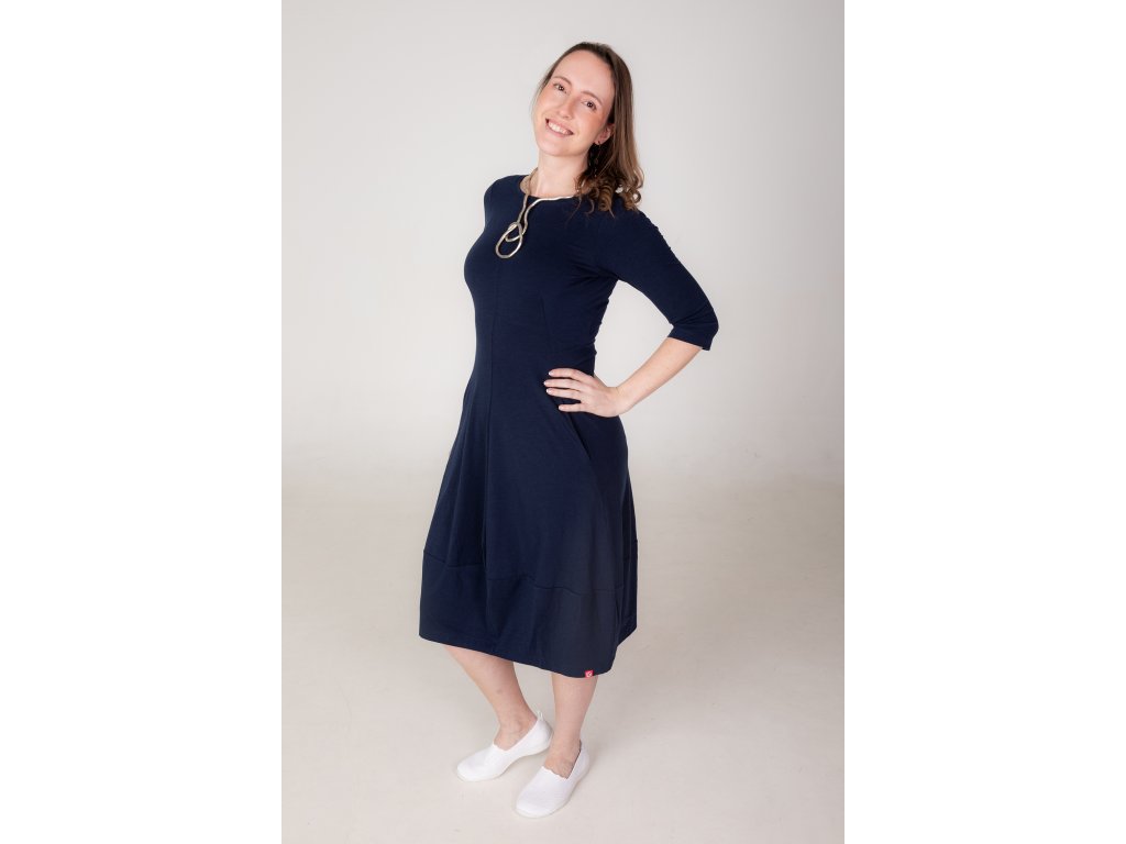 Balonová sukně volně splývá a přidává šatům originalitu a nadčasový charakter. Skrytá kapsová řešení přidávají praktičnost, přitom nenarušují elegantní siluetu. Tříčtvrteční rukávy a čistý kulatý výstřih dělají z šatů univerzální model pro celoroční použití.