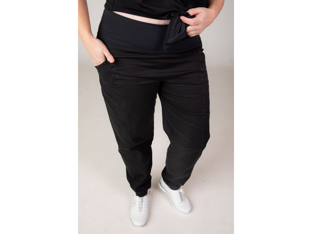 Střih je kombinací uvolněné horní části s pohodlným pružným pasem a volnější nohavicí s dolním zúžením v oblasti kotníku. Tento střih opticky prodlužuje postavu, působí moderně a dobře sedí napříč velikostmi.