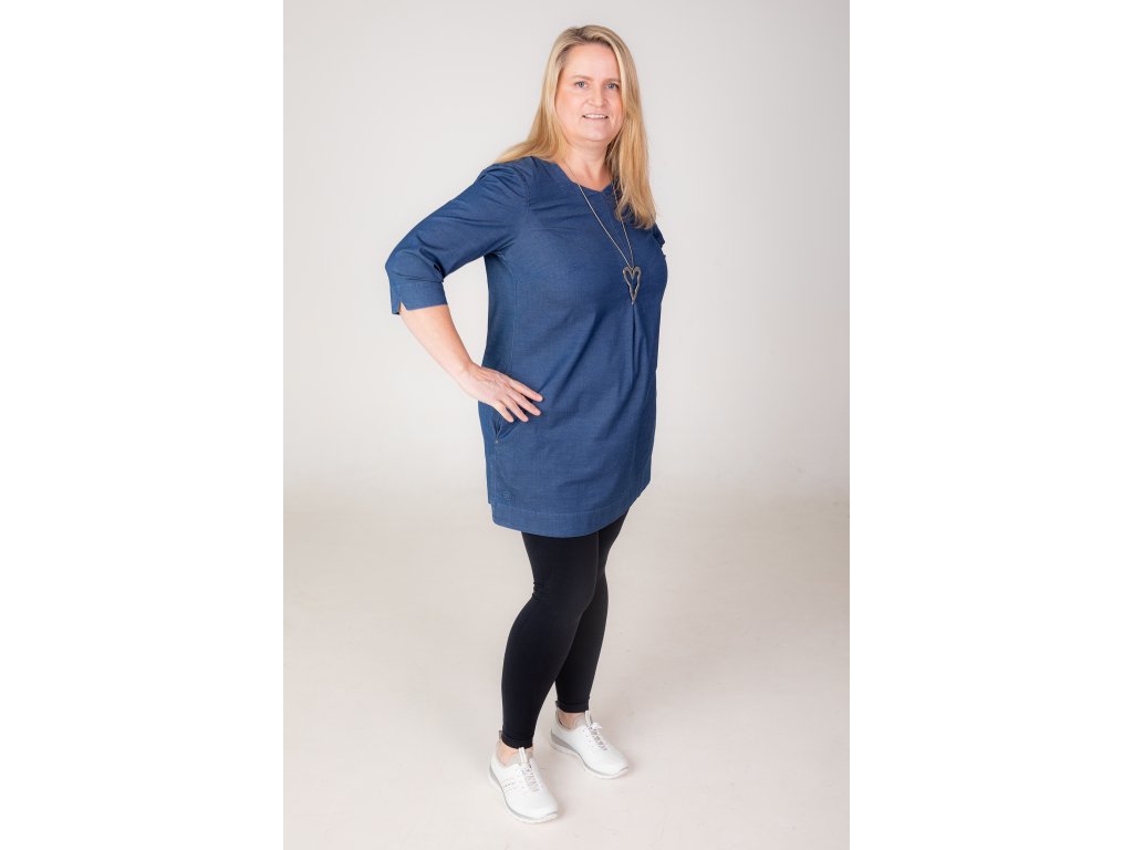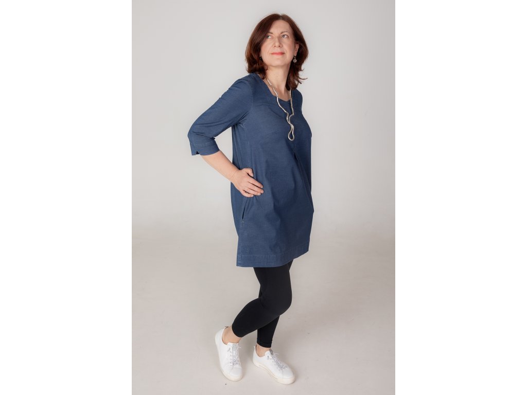 Měkký pružný denim je příjemný na těle, skvěle drží tvar a neomezuje v pohybu. 3/4 rukávy působí lehce a prakticky, zatímco velké boční kapsy dodávají tunice funkčnost.